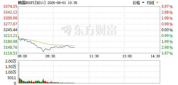8月1日,韩国KOSPI指数早盘一度大跌超3.7%,截至发稿,跌幅为2.95%。